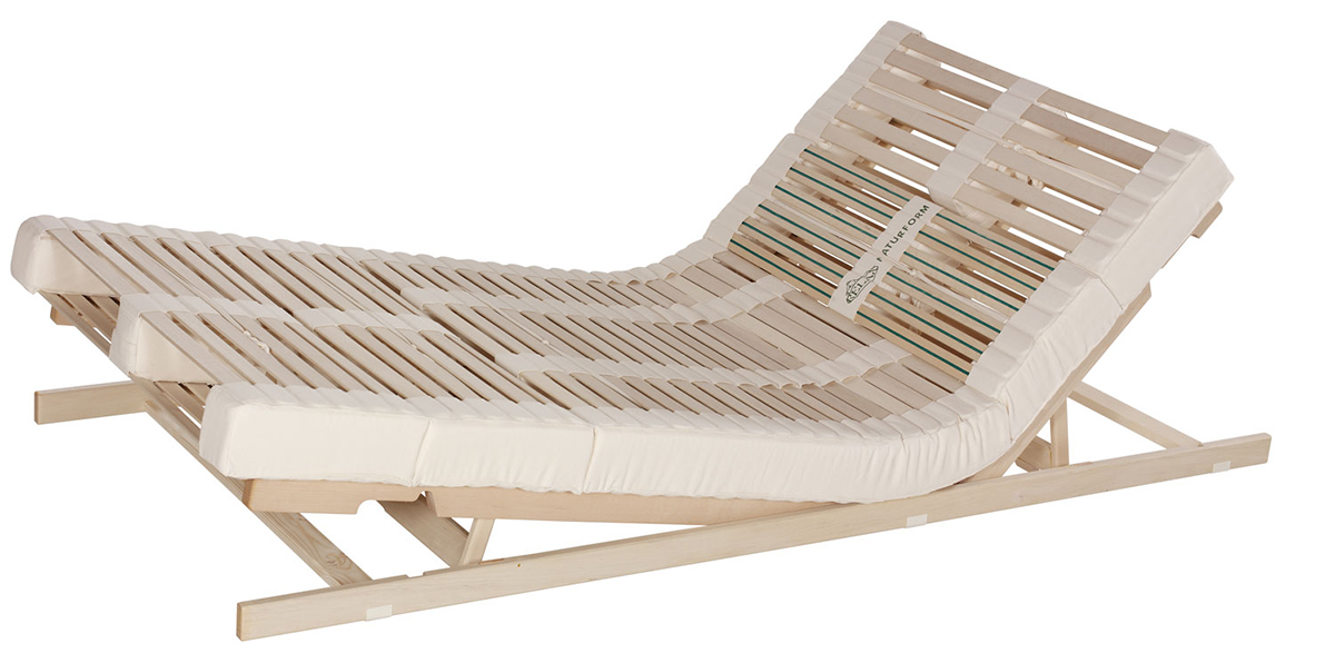 Das Schlafsystem Naturform ist mit einer Einsinktiefe von 90 mm und den flexiblen Einstellmöglichkeiten ideal für Seitenschläfer und Personen mit ausgeprägtem Körperbau. Das Doppellamellensystem ist auf elastischen Körpern aus Latex gelagert.